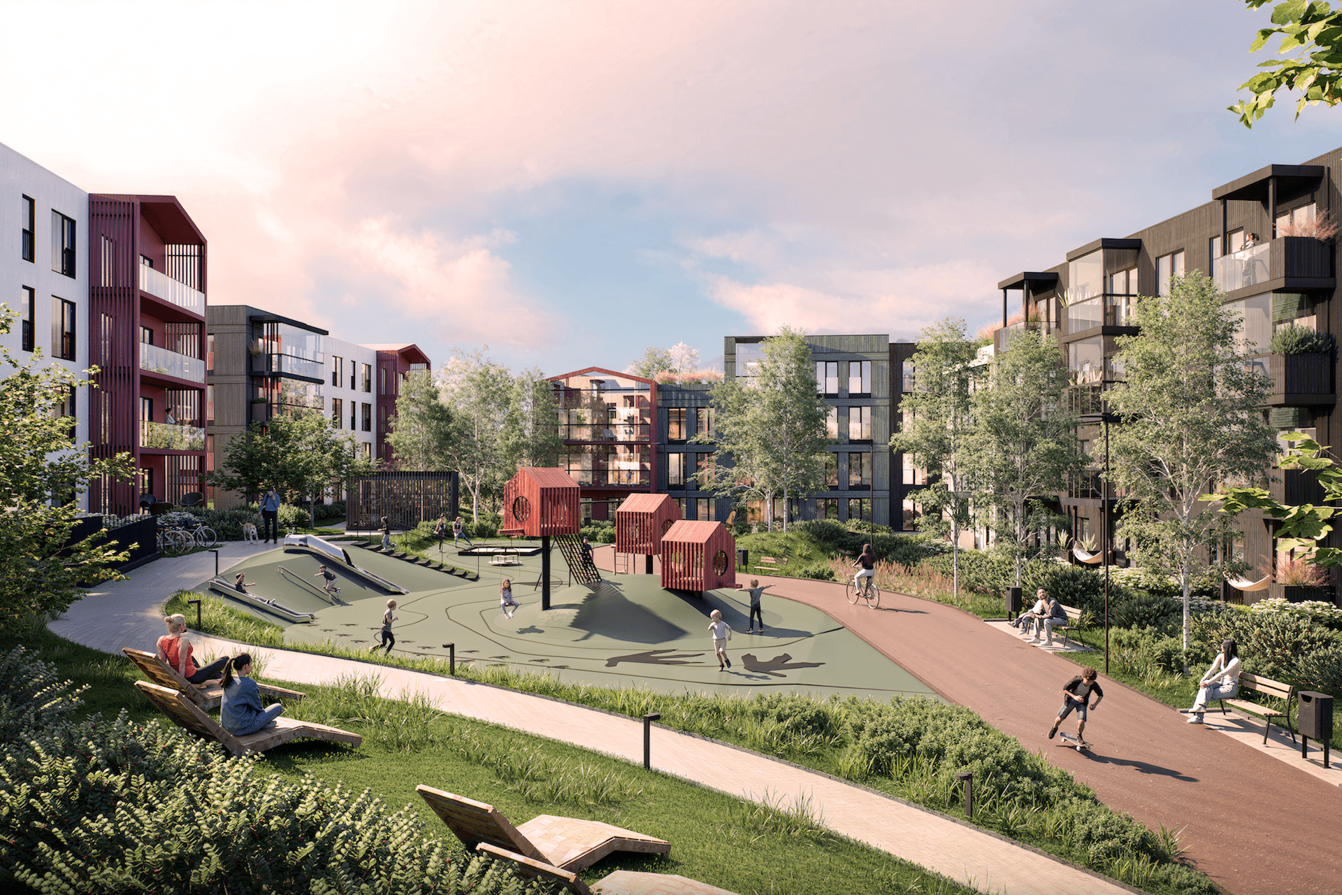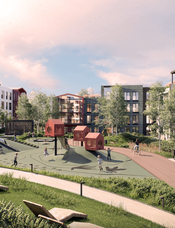Mänguliselt reljeefne ja haljastatud sisehoov, kus paiknevad mängu- ja puhkealad.