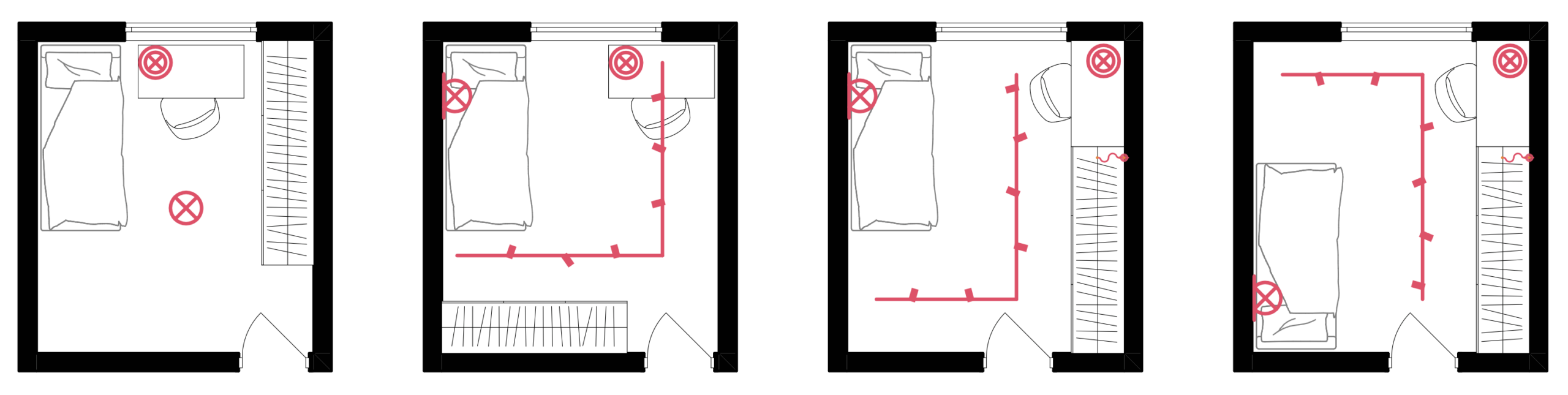 Soovitame lisada püsitoite kapi asukohta, et vajadusel kappi seestpoolt valgustada. Voodi kõrvale võiks kavandada asukoha seinavalgustile – väikelapse puhul öölambile, suurema lapse puhul lugemislambile. Siinivalgusti annab võimaluse valguse suunamiseks, lisavalgustite paigaldamiseks ning lülitusskeemi muutmiseks tulevikus.